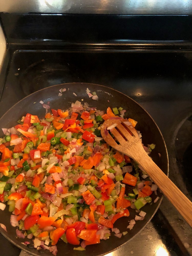 I had to make a call, so I detached about 43.4% of one poblano pepper, bagged the remainder, banished the seeds, and cut it up as finely as I could, following my old principle that “Peppers are not your friend unless they’re Bell.” The red bell pepper, of course, was easily prepped, wheat before my sickle. I can chop a mean bell pepper, no matter the color, great for snacks, because even a six year old likes chopped bell pepper as snack.