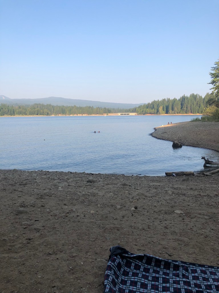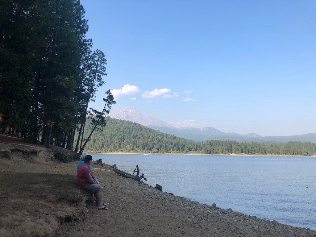 We found Lake Siskiyou Camp Resort nestled on the shores of its namesake, a large reservoir southeast of Mt. Shasta. There’s a central hub of campsites around a grill, movie theater, and beach, and as we drove in on our way to the site, it was uncomfortably busy-looking in terms of milling people. But fortunately, you aren’t forced to stay with the crowds. From our quieter trailer site, a little ways removed from the central hub on a separate peninsula of campsites, a short downhill walk through pine trees led to a semi-private beach area, perfect for swimming, sitting, looking at the mountain, and enjoying a bit of peace and quiet, even though the air was a little bit gritty.