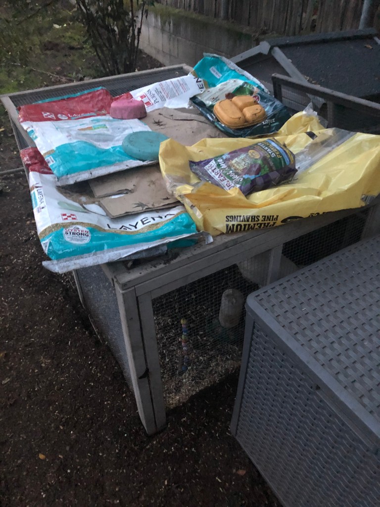 Wintry weather brought challenges. In reality, their current hutch doesn’t provide much shelter now that they’re all so big, and the run is open to the rain. Below you’ll see the best of several improvised attempts at temporary shelter for my little feathered friends: