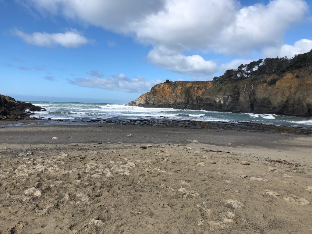 We started down the trail from the parking area, enjoying the cool air, blue skies, and a morning quiet except for the eucalyptus trees along the path squeaking in the breeze like a door that needs a drop or two of WD-40. The path soon opened up to a view of the cove and rolling breakers.