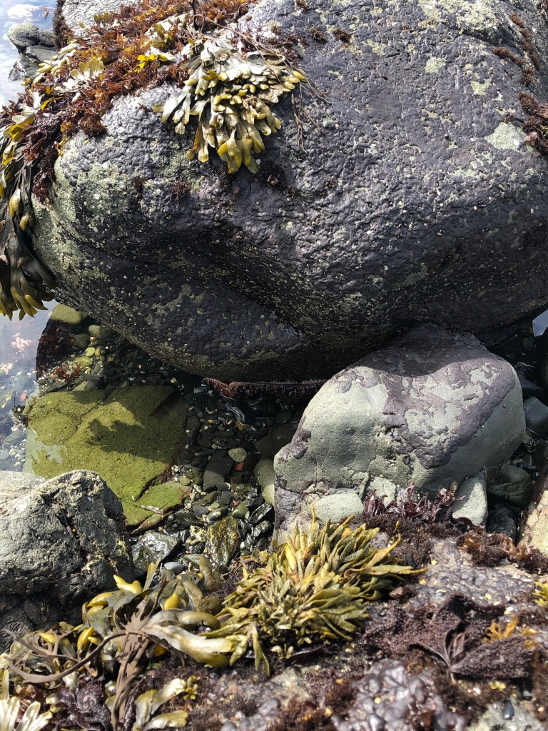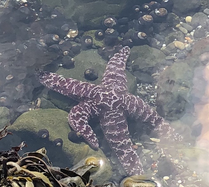 P had been to this beach earlier in our stay on an outing with M, so she was eager to show it off to me, leading the way over damp boulders, where we found a network of vibrant, connected pools, where we got some great views of hermit crabs, snails, and sea stars like the beautiful specimen above, which I think is an ochre sea star.