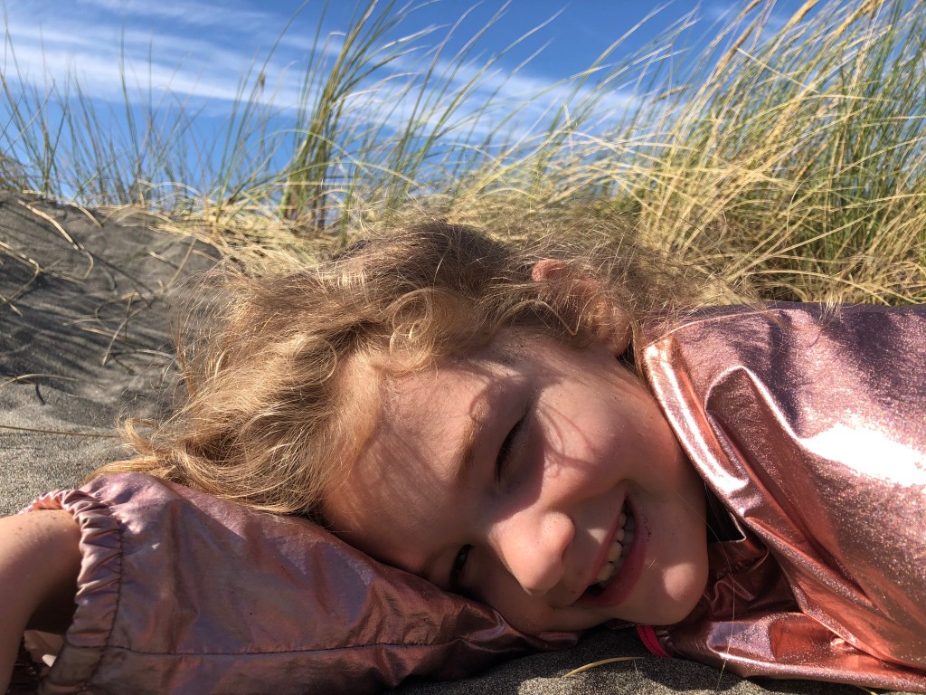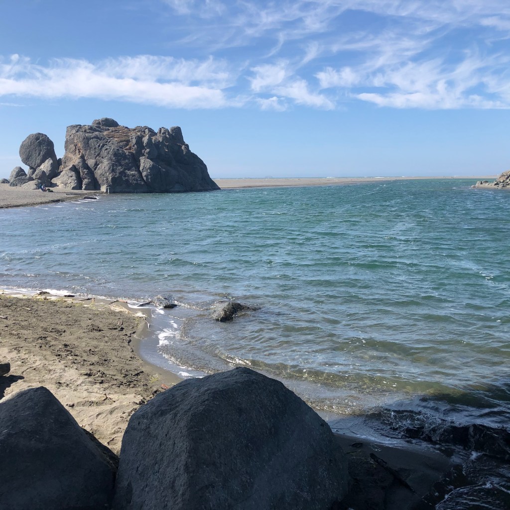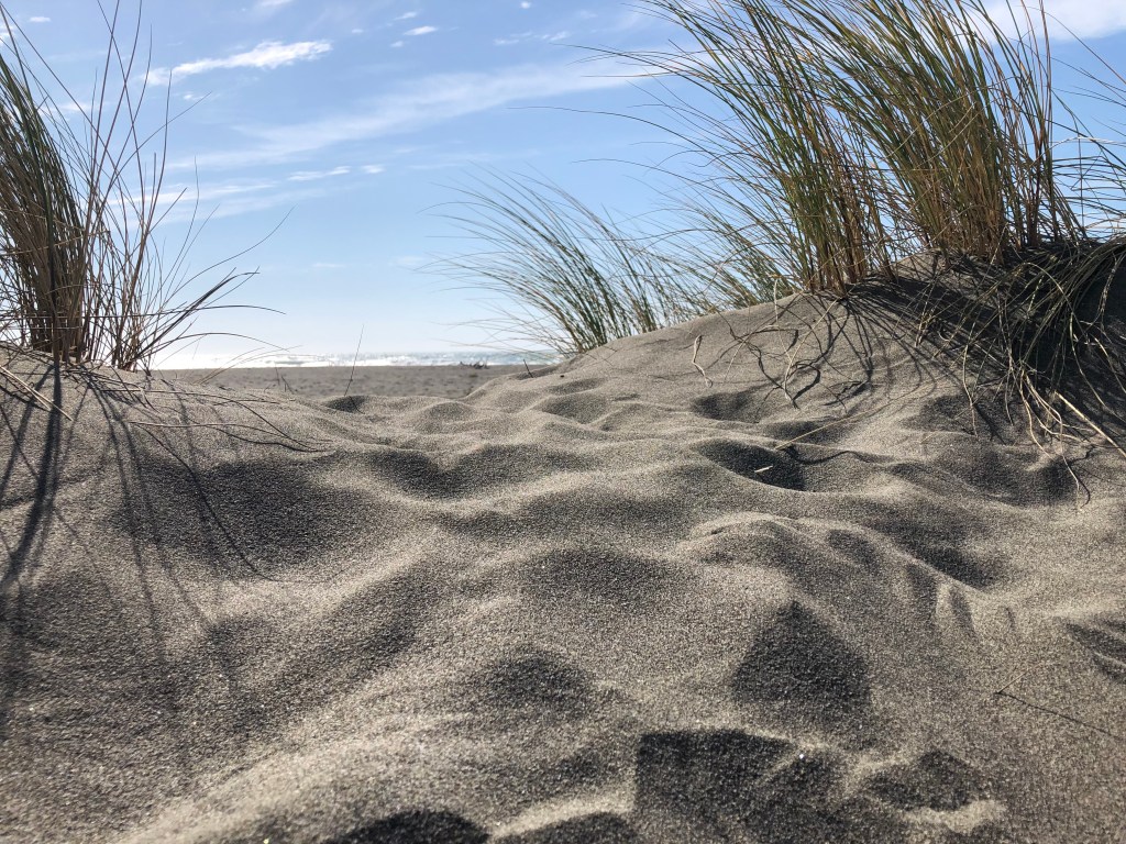 Once we settled and got hooked up to the various connections, P and I headed for the water. A short, stony trail led to a wide, sandy beach of dunes and rocks, next to the mouth where Hunter Creek feeds the ocean.